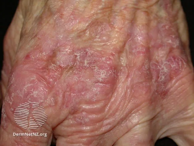 Rough, scaly patches on the back of the hand of a person with sun-damaged skin