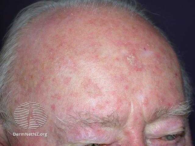 Actinic keratosis presents as a rough, scaly red patch on sun-damaged areas. Sometimes you can feel it more than you can see it, and it will feel crusty or sandpapery.