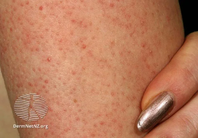 An example of keratosis pilaris, which many people have on the back of the arms or legs, and looks like rough, scaly, red, “chicken-skin” bumps.