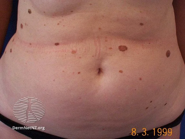 A patient with multiple atypical moles which is a risk factor for the development of melanoma.