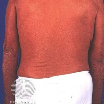 An example of erythrodermic psoriasis, which shows up as a sunburn-like rash on the whole body or almost the whole body.