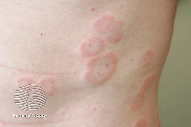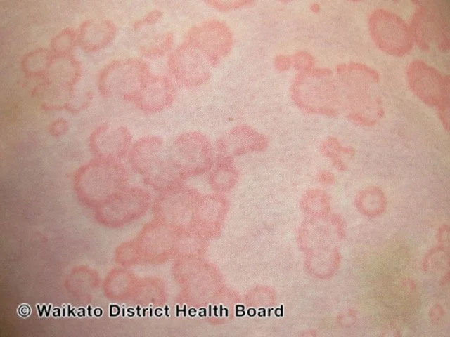 Hives or urticaria appear as itchy, swollen welt-like bumps and plaques on the body.
